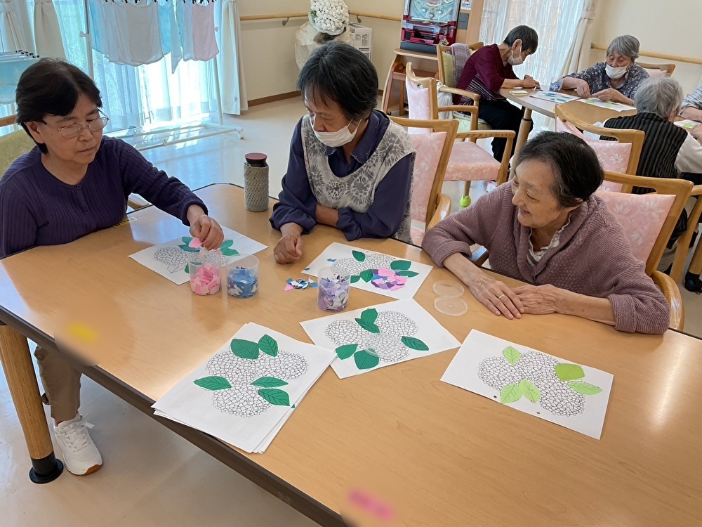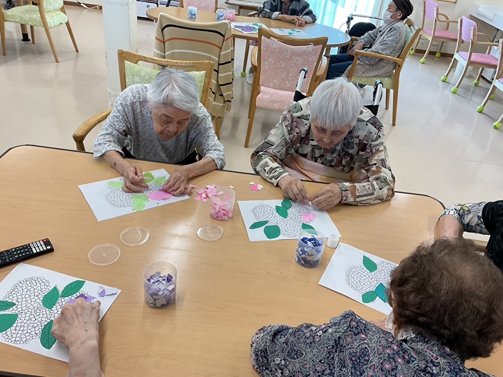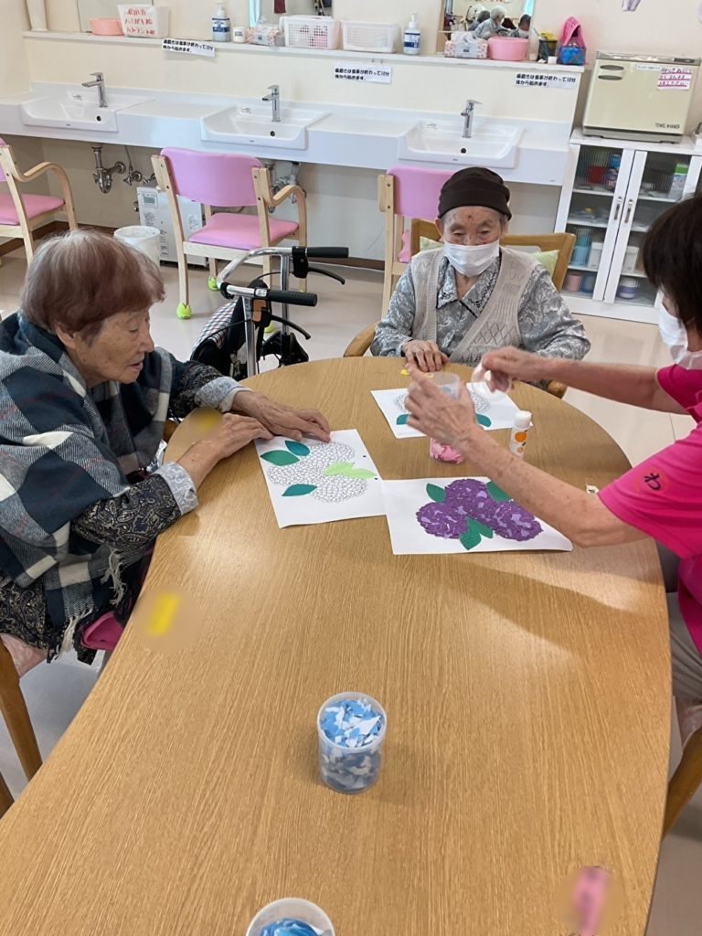 貼り絵づくり 2025年7月23日 最終更新日時 : 2025年7月23日 2ek2caj ショートステイわでは、季節の花「あじさい」をテーマに貼り絵づくりを行いました。色とりどりの紙を丁寧にちぎって、一枚一枚思いを込めて貼り合わせていきます。皆さん真剣な表情の中にも、笑顔があふれる和やかな時間となりました。 完成したあじさいの作品は壁いっぱいに飾られ、施設内が明るく彩られました。それぞれの個性が光る、素敵な作品が揃いました。 Follow me! FacebooktwitterHatenaPocketCopy