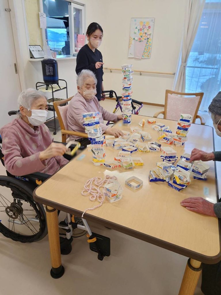 細く切った牛乳パックをどれだけ積み上げるか競争です