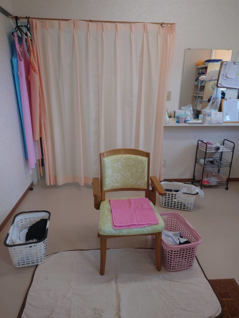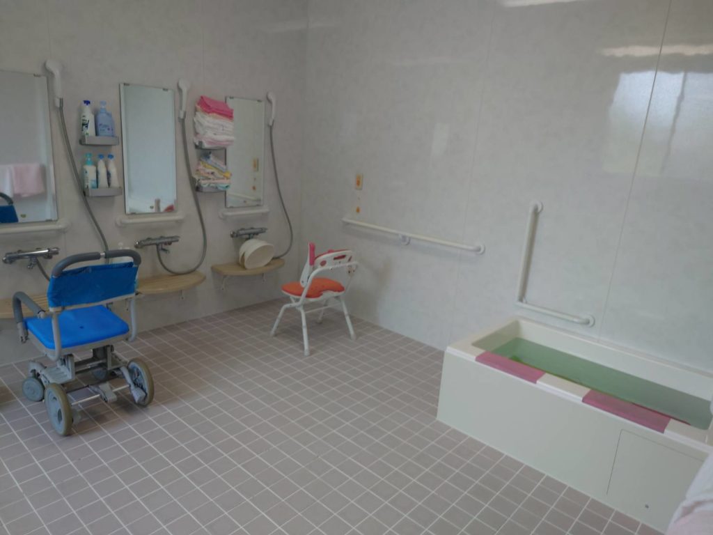 主に2名の女性職員が脱衣場と浴室に配置し、安全に配慮しながら利用者様のお手伝いを行っております。