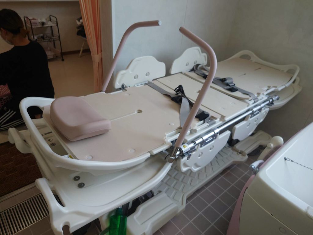 専用ストレッチャーに乗って頂き、体を洗った後に仰向けになって入る浴槽で、必ずオペーレーター二人を配置し安全に配慮しながら行っています。