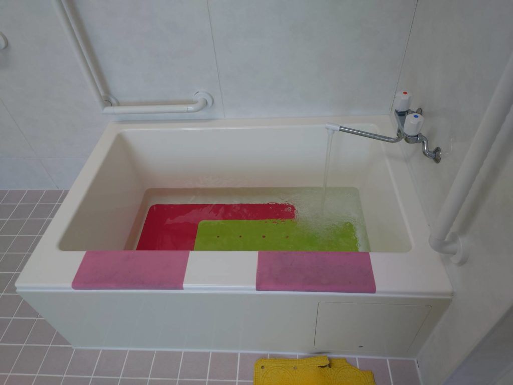 浅くて肩まで入らないというお声も頂きますが、肩には職員がお湯をかけながら、ゆっくりお湯に浸かり温まって頂きたいと思っております。